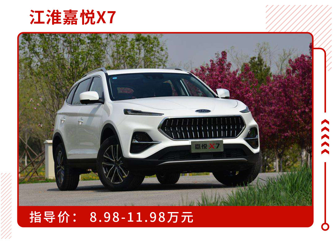 紧接着就是江淮嘉悦X7了,作为江淮乘用车3.0时代的首款SUV车型,这款车据官方说将与大众共生产线生产,质量上应该有所提升。嘉悦X7的定位是中型SUV,轴距为2750mm,但它的指导价仅为8.98-11.98万元,也就是说这款车的卖点是大空间,也确实比前面两车大。