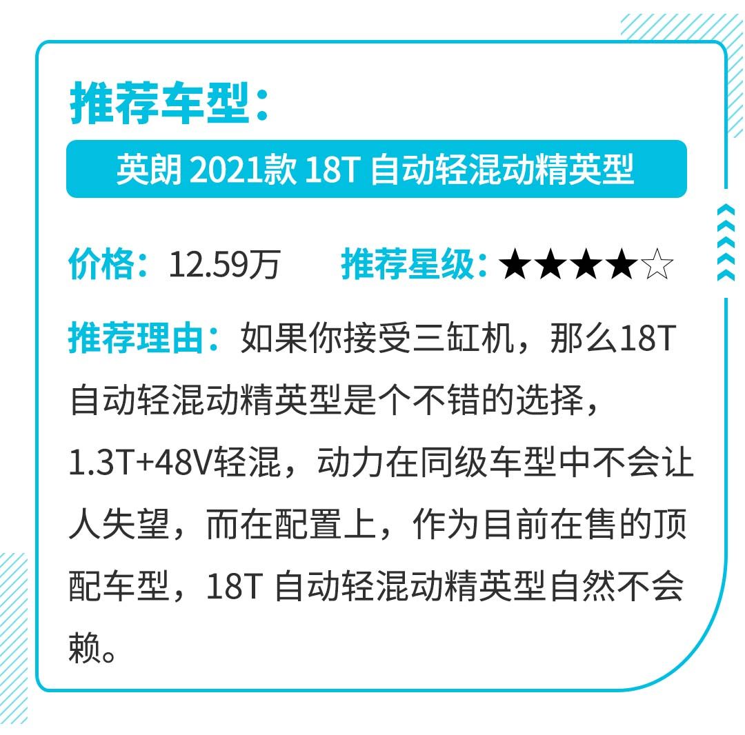 很多人对三缸机有阴影,抖动、动力弱似乎是永远抹不去的痛,但当你坐在车内的时候,发现也没想象的那么糟糕;而在动力方面,无论1.0T还是1.3T,动力都不弱,1.0T发动机能够爆发125马力的动力,1.3T更是能够爆发出163马力的动力,并且新款的英朗配备了48V轻混系统,初段时提供动力输出,让起步更加轻快、平顺。