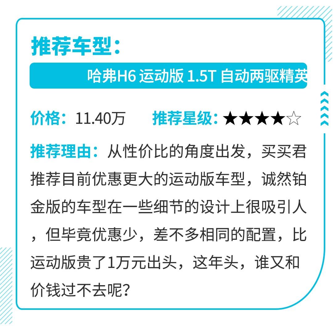 可以看出铂金版的定位会比运动版更高一些,所以别看H6铂金版1.5T车型的售价和运动版1.5T的起步价都是10.4万元,但终端的优惠完全不一样。