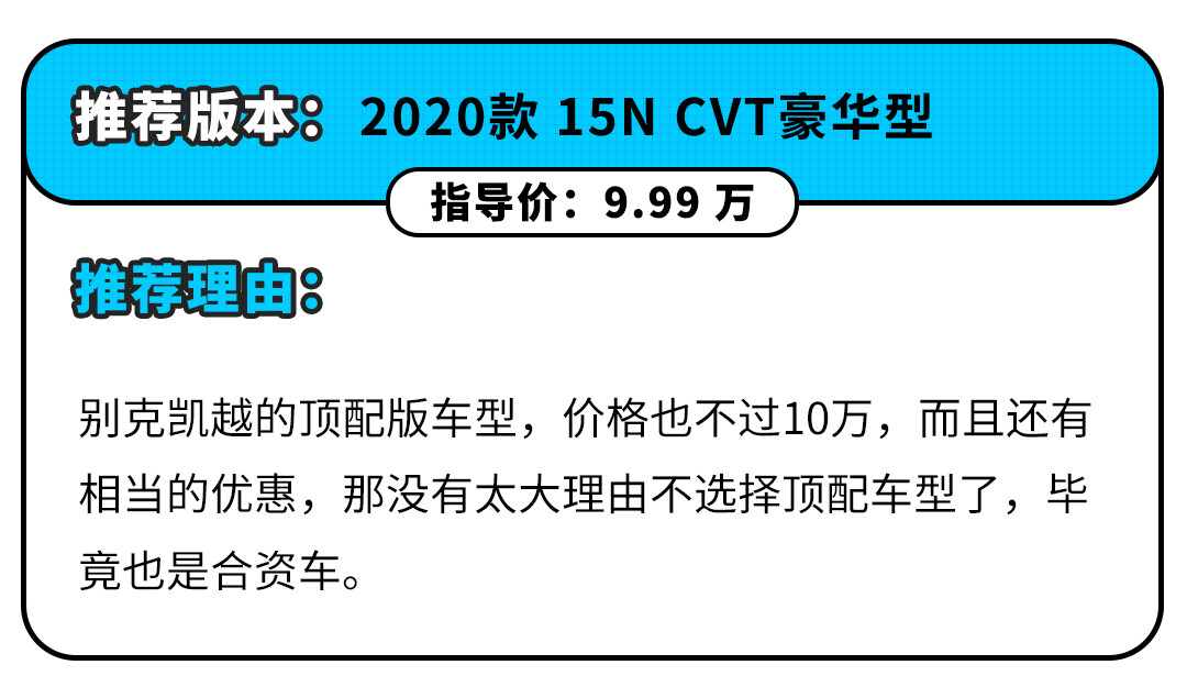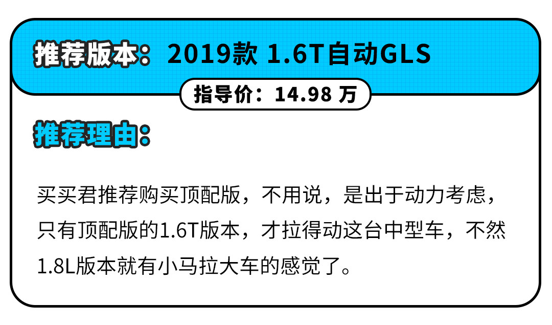 买买君推荐购买凯绅的顶配版,不用说,就是看动力,因为1.6T发动机只有最高配才配备。而1.8L发动机的动力过于弱鸡,想要拉到凯绅这台中型车,有些小马拉大车的嫌疑。