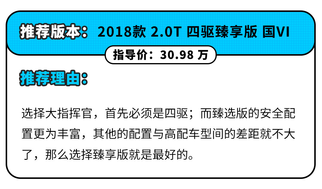如果一定想入手吉普大指挥官,买买君推荐四驱臻享版。因为大指挥官国V、国VI版本均有售,那么首先排除国V版;其次要选择四驱版,买这样的硬派SUV,偶尔还是要去非铺装路面撒下野;最后是臻享版安全配置更高,并且并不比顶配少太多配置,没有理由不选择。