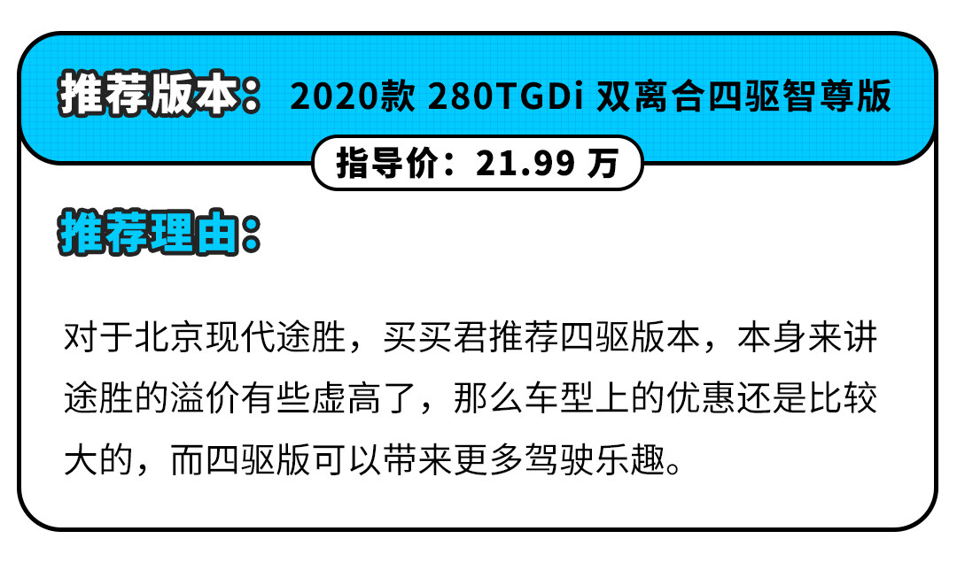 现代途胜买买君推荐车型为四驱智尊版,同时也是国VI车型最高配版本。这是因为作为一款本身价格有些虚高的车型,后期的优惠肯定会给到位,而选择四驱版可以增加一定的驾驶乐趣,所以选择四驱智尊版是最佳选项。