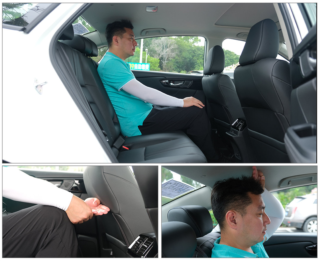 而大轴距带来的实际表现同样出色,从183cm身高的乘客体验来看,前排调整好坐姿后头部还有着足够的空间。而前排调整好坐姿不变的情况下,后排还有着一拳三指的腿部空间,三指的头部空间。