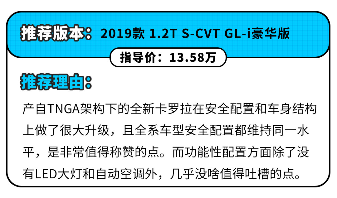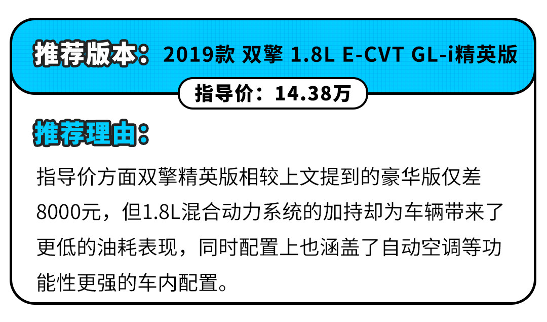 而卡罗拉双擎的门槛售价为13.58万(先锋版),但中控屏、倒车影像、电动天窗等常用功能的缺失导致入门版并不能满足一般家庭用车的配置需求,而指导价14.38万的精英版则会相对更值得挑选。
