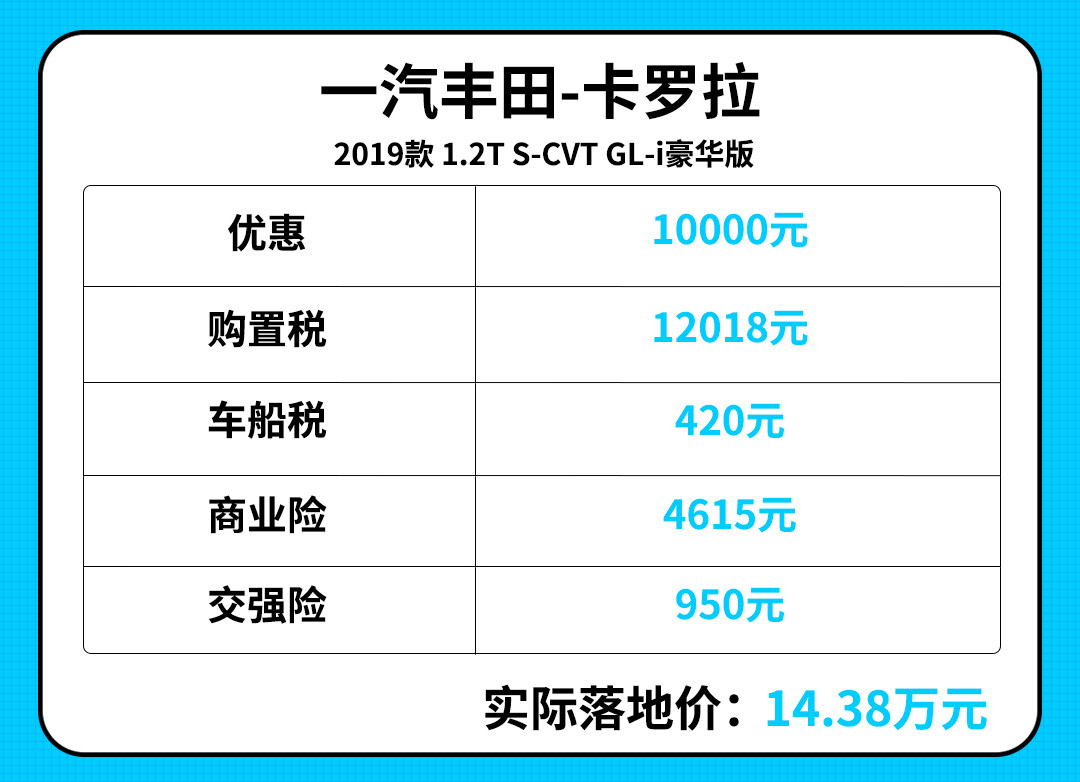 卡罗拉1.2T豪华版的指导价为13.58万,目前部分地区终端拥有1万元的现金优惠,对于常年售价坚挺的丰田品牌来说,1万元的优惠已经算是相当不错的优惠水准了。而计算上保险、购置税等各项费用后,车辆最终落地价在14.38万,符合15万预算的购车条件。