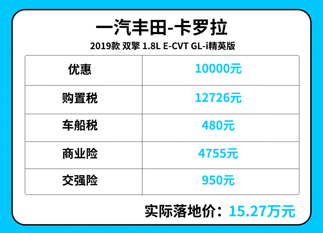 同样以1万现金优惠计算,优惠后的卡罗拉双擎1.8L精英版裸车价为13.38万,加上保险等部分收费款项后,车型最终落地价位15.27万。其实对比燃油版,双擎版在售价上相差不足1万,但油耗方面不同版本之间却有着比较大的差距(百公里综合油耗,燃油版为6.8L,双擎版为5.6L)。综合对比,卡罗拉双擎版会是笔者比较首推的车型选择。
