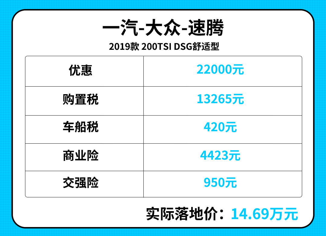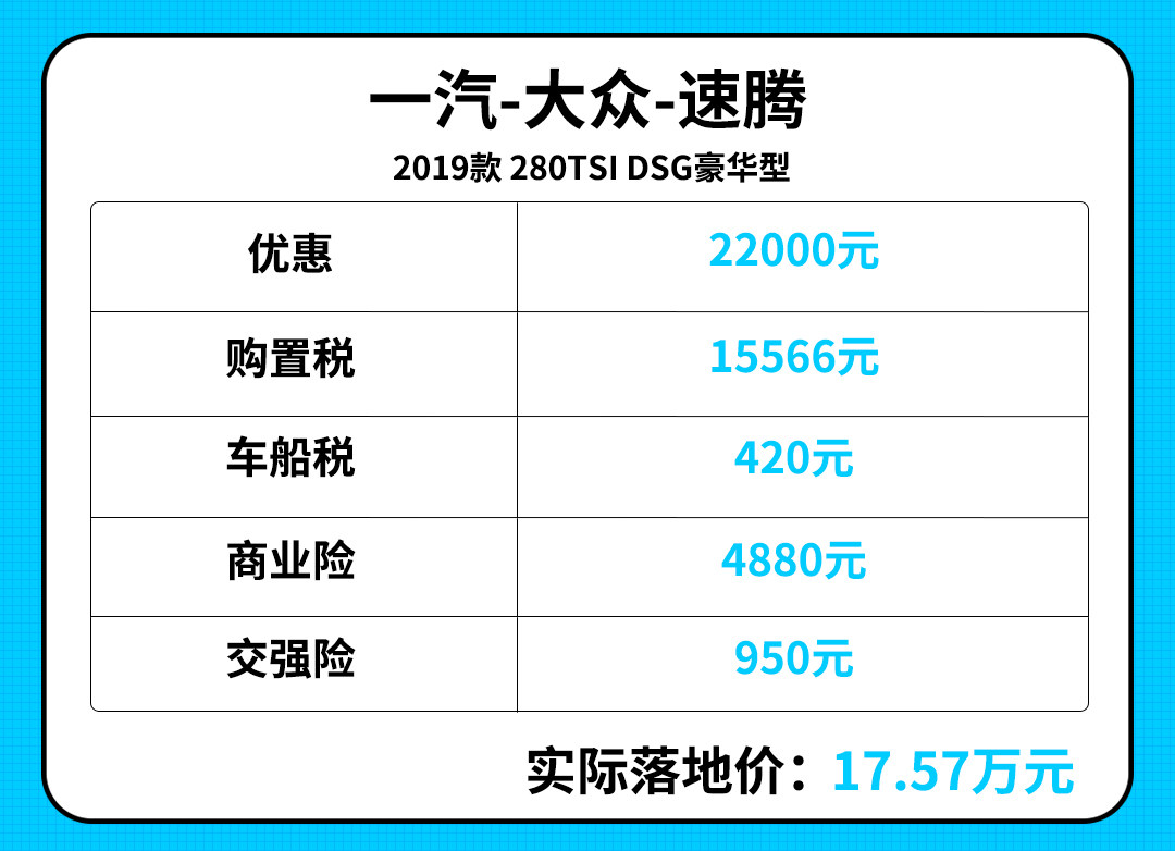车辆定位高半级带来的自然是高出半级的市场售价。在动力方面,速腾提供了1.2T和1.4T两套动力方案,而大多消费者更倾向于选择动力更强劲的1.4T版本,以指导价17.59万的豪华型为例,市场上目前有着3万左右的综合优惠,但基本都需要在店内贷款、店内上保险和上牌。而江浙一带和重庆地区4S店则有现金优惠,优惠幅度在2~2.2万左右。