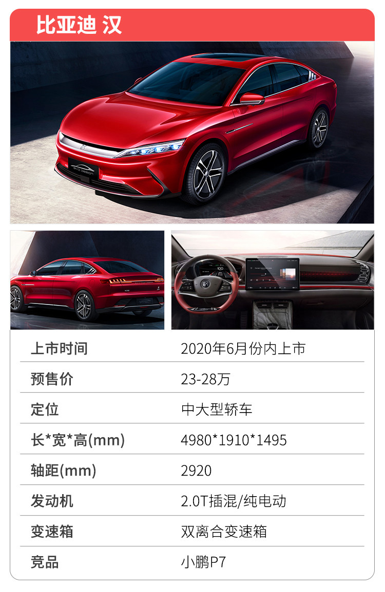 新车作为比亚迪的最新旗舰轿车,定位中大型轿车,这是中国品牌少数敢于冲击中高端轿车的。比亚迪汉也确实有着旗舰般的能耐,车身尺寸就达到了4980*1910*1495mm(EV版本)以及4960*1910*1495mm(DM版本),轴距均为2920mm,在同价位中占据优势。此外是动力方面,EV版本采用了最新的刀片式电池技术,在穿刺试验中并不会起火,安全性能最佳,至于续航方面则是能达到550-605km,最强有着3.9s的破百成绩;至于2.0T插混的DM版本车型,则是能够实现4.7s的破百成绩,表现同样不俗。加上它本身较强的驾驶辅助系统,教授认为它更有资格称作“中国的特斯拉”。
