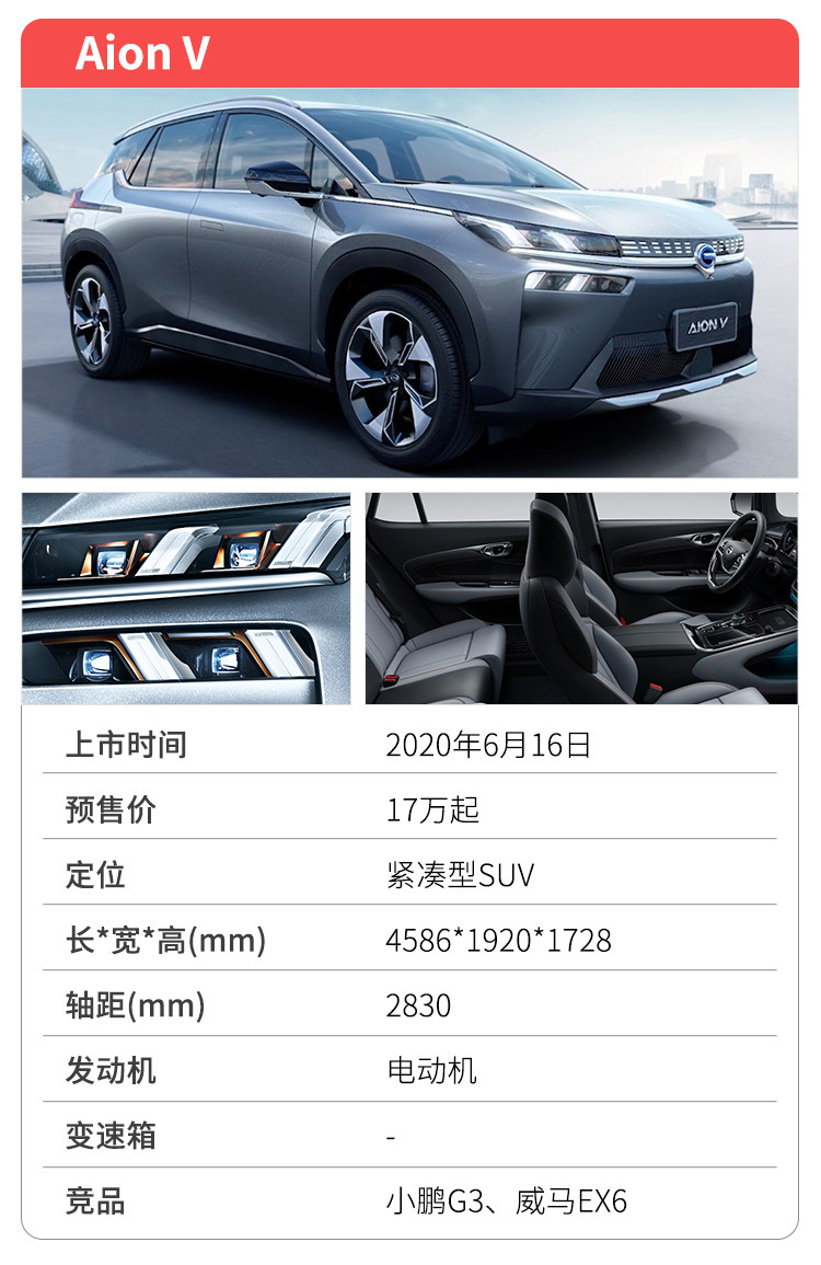 新车虽然定位紧凑型SUV,但有着接近中型SUV的水准,车身尺寸为4586*1920*1728mm,轴距则是2830mm,在拥有轻巧驾驶感同时还有同级别更大的空间。Aion-V采用了最新的“机甲兽“前脸以及”光爪电眼“分体式大灯设计元素,设计相当前卫。至于动力方面,如今仅能了解到将推出400km、530km以及600km续航版本。但参考同品牌车型,或许新车搭载Aion-S相同的动力总成,后者采用了135千瓦、300牛·米的电动机。新车更多意义在于填补品牌产局矩阵,满足限行限牌城市用户的出行需求。