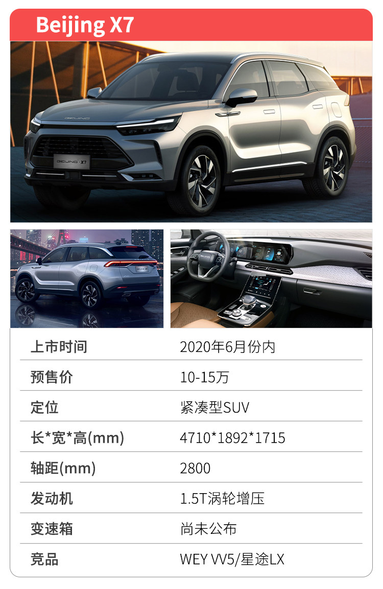 X7与奕炫GS一样,都可以说是品牌的“突破之作“,这款X7有着品牌中最强的竞争实力,定位中型SUV的它车身尺寸达到了4710*1892*1715mm,轴距为2800mm,视乎如今10万起的预售价,性价比颇高。除了最新的家族式设计,它还采用了弹出式门把手、LED大灯等元素,车厢内部则是简约化设计,配备了贯穿式双屏、液晶空调控制屏幕、电子挡把等配置,精致感十足。动力方面则是188马力的1.5T发动机,峰值扭矩275牛·米,未来还将加入插混车型。换上新车标的BEIJING,确实给了消费者一个惊喜。