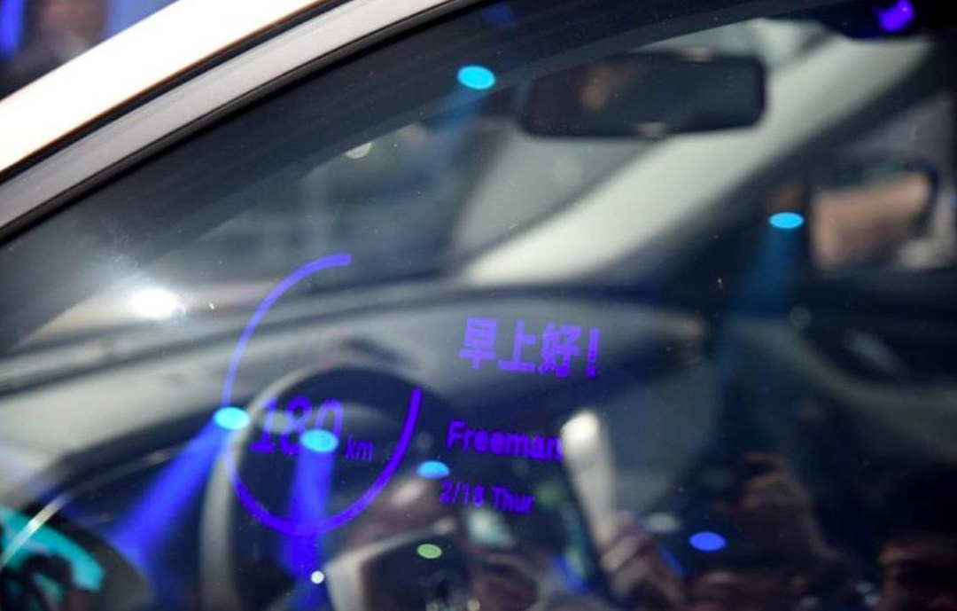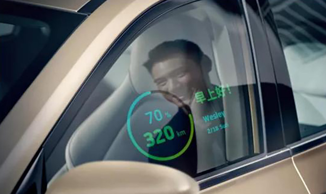 在威马EX5的选装包中有这样一个特别选项——互动式车窗投影,它是威马独创的一项车主交互功能。当用户接近车辆的时候,位于车门后视镜内侧的投影仪就会将车辆剩余电量、续航里程、规划路径等信息,投射到主驾驶侧车窗上面。