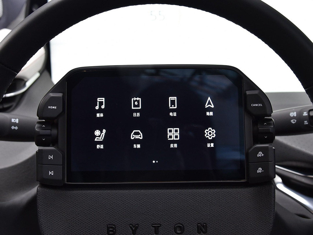 并且拜腾 M-Byte在方向盘上还创新的配备一块7英寸的触控液晶显示屏。这块屏幕主要控制车内的音乐,地图,空调等等,使得驾驶者在驾驶的过程中操作更加方便。这样的工程设计带来的一个结果就是它不能跟着方向盘一起旋转,就像老雪铁龙世嘉一样。小编在想,要是激烈驾驶会误触吗?