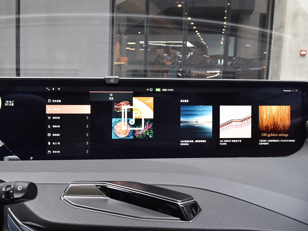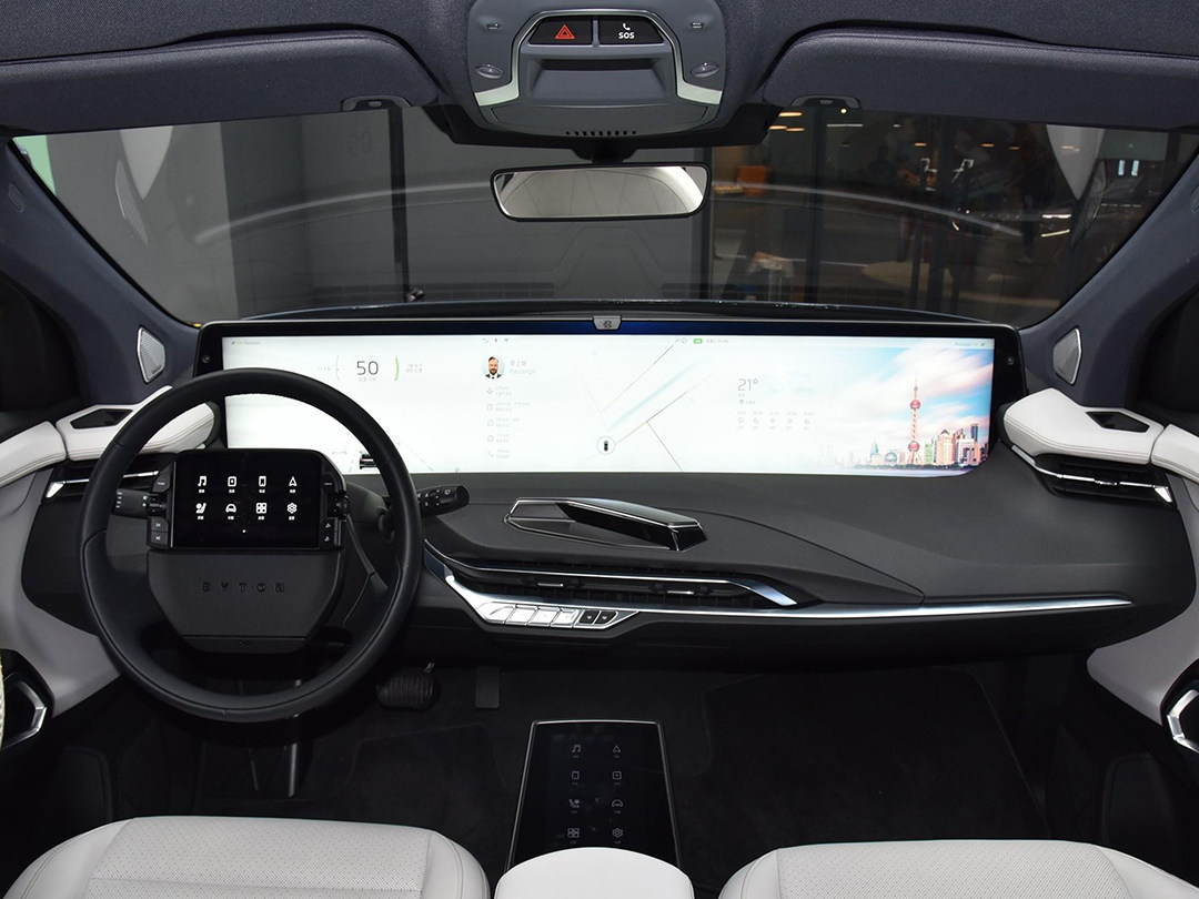 说实话,这么大一块显示屏真的不会分神吗?不过不得不说,拜腾 M-Byte搭载的这块48英寸车载大屏是真的炫酷,这应该也是所有量产车中最大的车载大屏了吧。这块巨型屏幕贯穿主副驾驶位,左侧显示车辆信息,中央作为菜单区,右侧则显示其它菜单功能,如社交软件等。而由于屏幕太大、触控滑动行程实在太长,拜腾还采用了语音+触控+实体按键的交互方式。