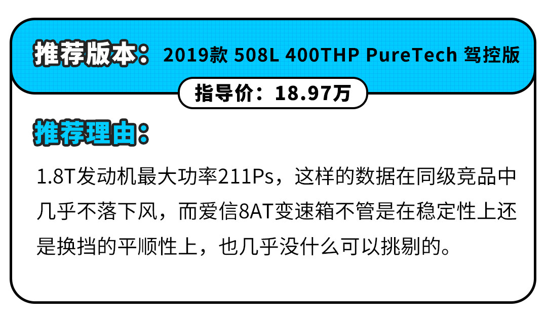 但东风标致引进的508L却又是一款实力、颜值兼具的产品。1.8T发动机在世界舞台上获奖无数,匹配的也是一款调校非常出色的8AT变速箱,底盘韧性和稳定性都非常出色,加上精准的转向手感,无论是三大件的水准还是主观的驾驶体验,我都会为508L打一个非常高的分数。