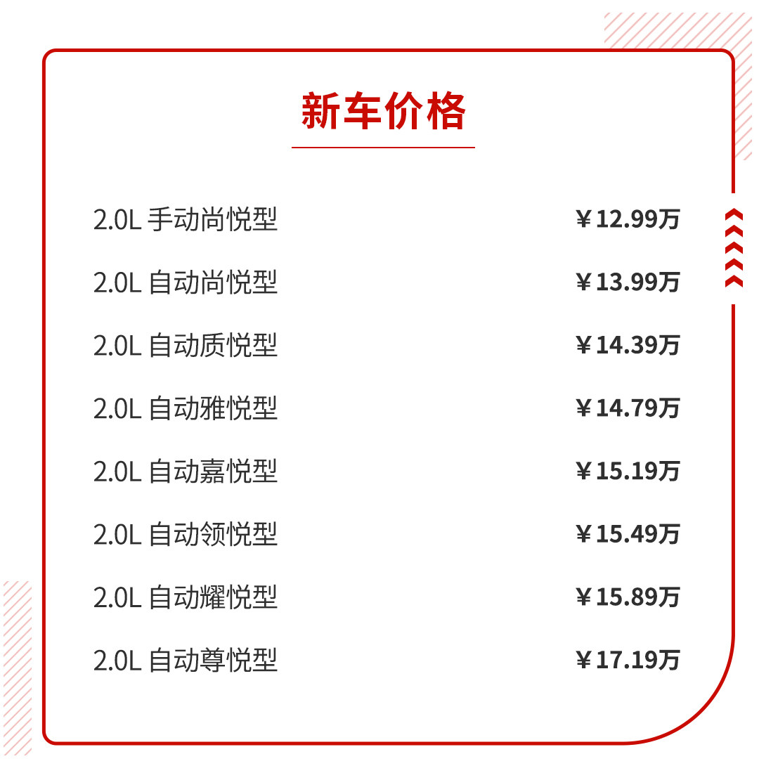 新车一共推出了8款车型,最低配(指导价:12.99万)的手动尚悦版开始就标配了电子驻车、带膝部安全气囊在内的7安全气囊、倒车影像、8.8英寸中控屏(支持手机互联)、LED大灯、16英寸轮毂、8扬声器音响、后排出风口等配置,实用性相当。并且2.0L+6MT的动力也相当有玩味,适合那些追求驾驶感的用户,只是缺少天窗颇为可惜。