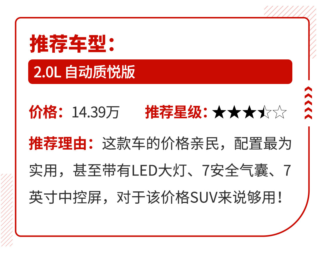 至于想要自动挡车型的用户,只需要增加1万就可以买到相同配置的自动尚悦版,而再增加0.4万,就可以弥补缺失天窗的不足,同时还增加了后驻车雷达以及真皮方向盘。所以以实用层面来看,该14.39万的质悦版最为实用,值得推荐。
