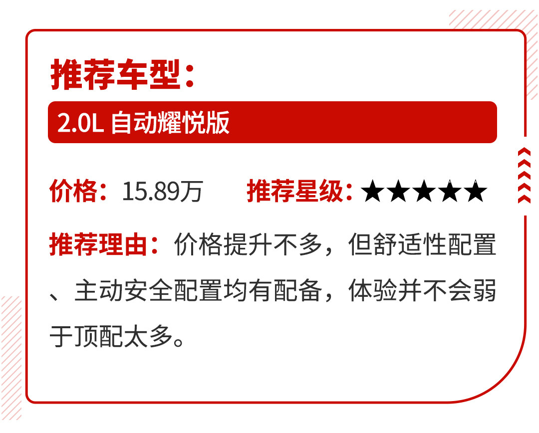 至于追求科技配置的,则15.89万元的次低配车型(自动耀悦版)最为适合,带有自适应巡航、真皮座椅、自适应远近光、自动空调、18英寸轮毂,还带有并线辅助、车道保持辅助、主动刹车等配置,以体验来说足以满足绝大多数用户需求。