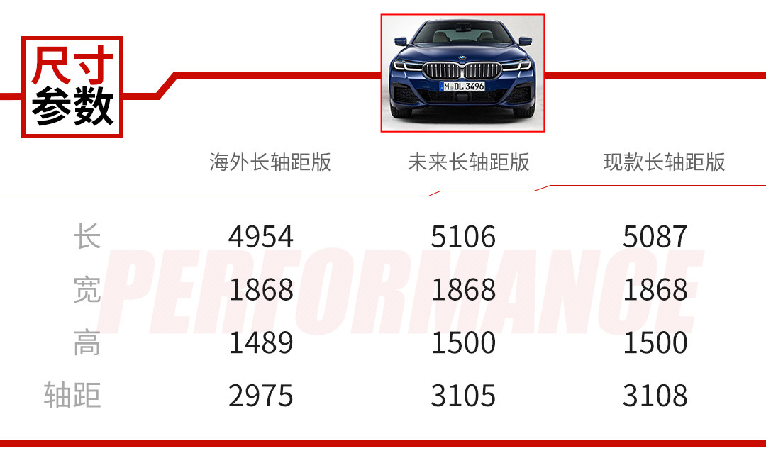尺寸上做了一些调整,国外的标准轴距版本增加了27毫米车长,而国内的长轴距版本宽度和高度都没有变化,长度增加了19毫米,轴距缩短了3毫米,改款后新5系车长将超过5.1米!