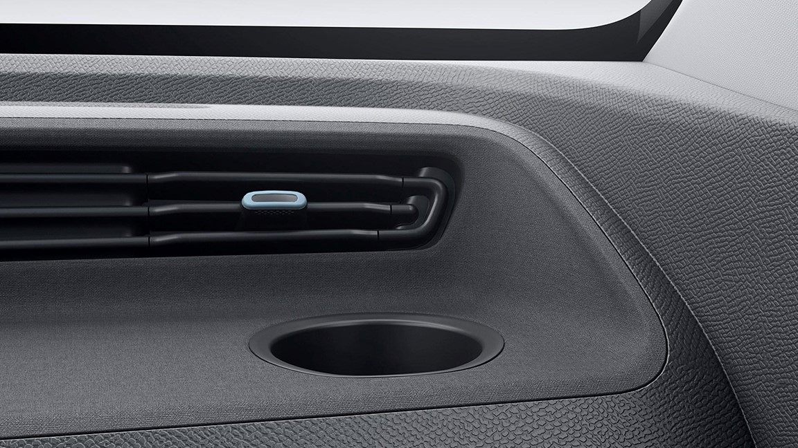 不妨来看看宏观MINI EV是如何利用空间:在前排部分,宏光MINI EV先在副驾驶前方设置了内嵌式杯架,值得注意该杯架的位置是在空调出风口前方,意味着杯架中所放置的饮品可与空调温度同步,冬暖夏凉足够人性化。