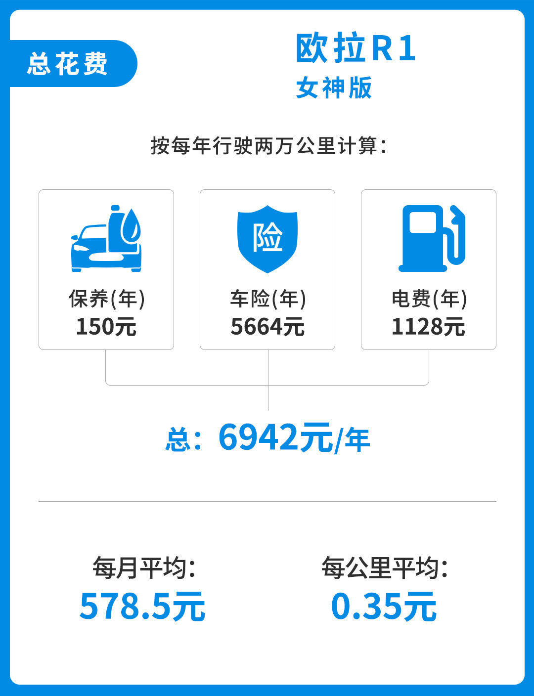 但纯电车的优势向来是后期所体现的,以一年2万公里计算,欧拉R1保养只需更换2次空调滤清器,费用大概为150元左右。欧拉R1百公里耗电量为9.4kWh,以家用0.6元的电费计算,一年电费为1128元,总体下来的养车费用比燃油车要低上不少。