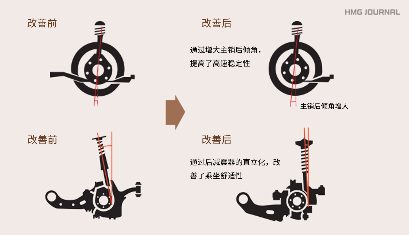 第三代平台i-GMP精心调校的底盘也提高了车辆乘坐舒适性。通过改变后减震器的安装角度,将原来向前倾斜的减震器设置成接近垂直的角度,降低了车辆经过凹凸路面时所吸收的冲击量,改善后座的乘坐舒适性。