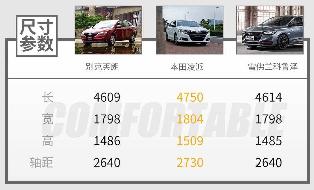 英朗车身长宽高分别为4609mm×1798mm×1486mm,轴距为2640mm,与老款车型保持一致,和同级别车型相比处于平均水平。