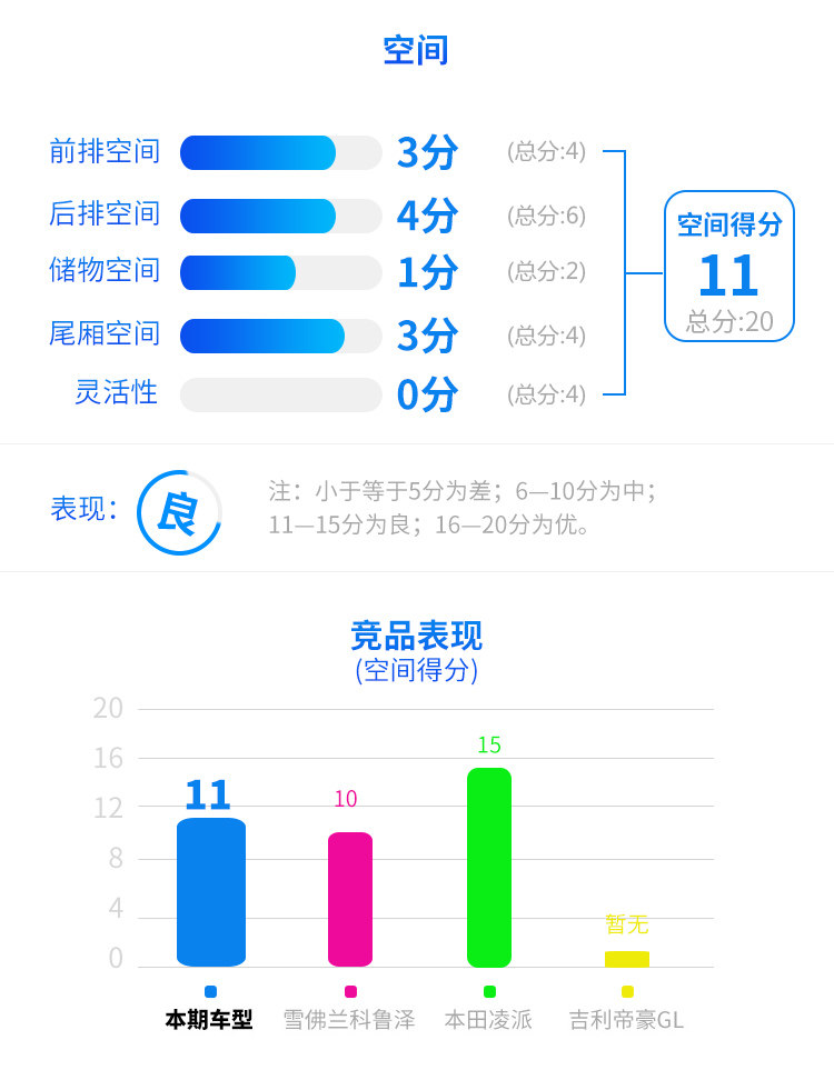 小结:现在很多轿车也开始支持后排放倒,但是英朗的后排还是像以往一样,因此在灵活性方面并没有得到分数。不过除了储物空间方面和灵活性的不足之外,英朗的其它空间表现可圈可点。家用车对于空间的要求还是挺高的,考虑到英朗这种车型一般载人的频率相对较高,因为空间方面的营造也是提升竞争力的一部分。