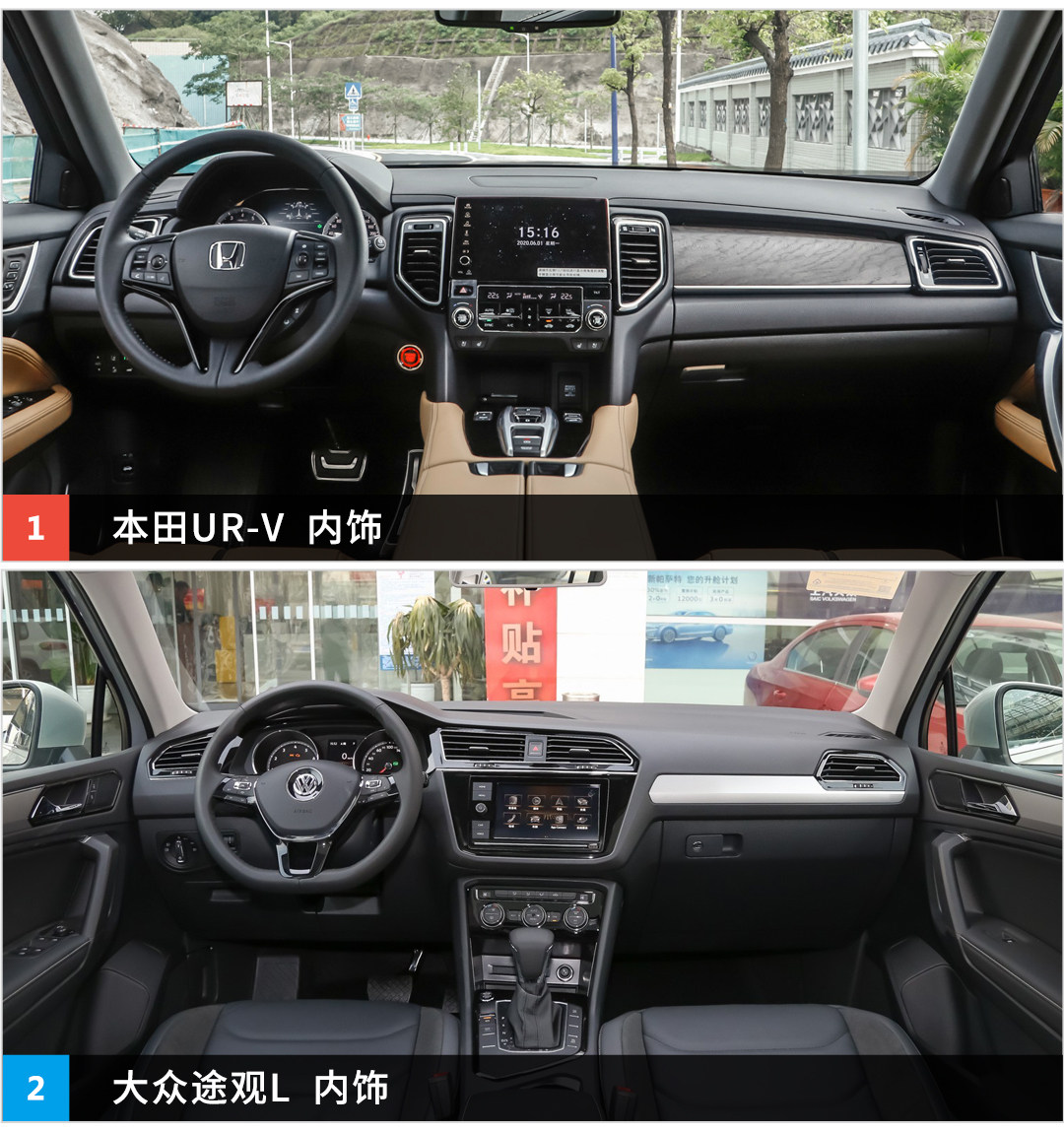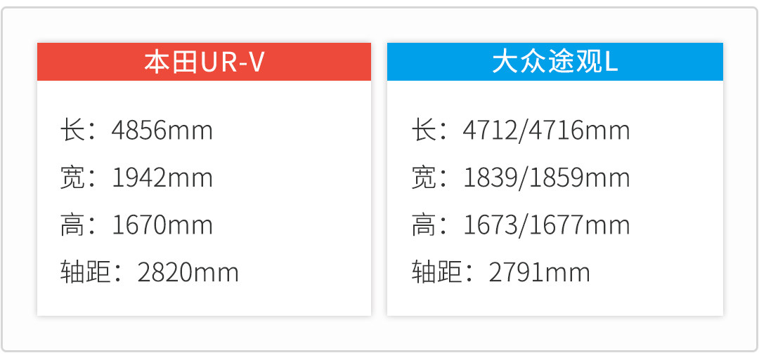 在车身尺寸的对比中,本田UR-V的数据是明显比途观L要大一圈,不过这也不难理解,虽然都是中型SUV,但本田对于UR-V的定位是要高半级的,所以车内空间也要略好于途观L。