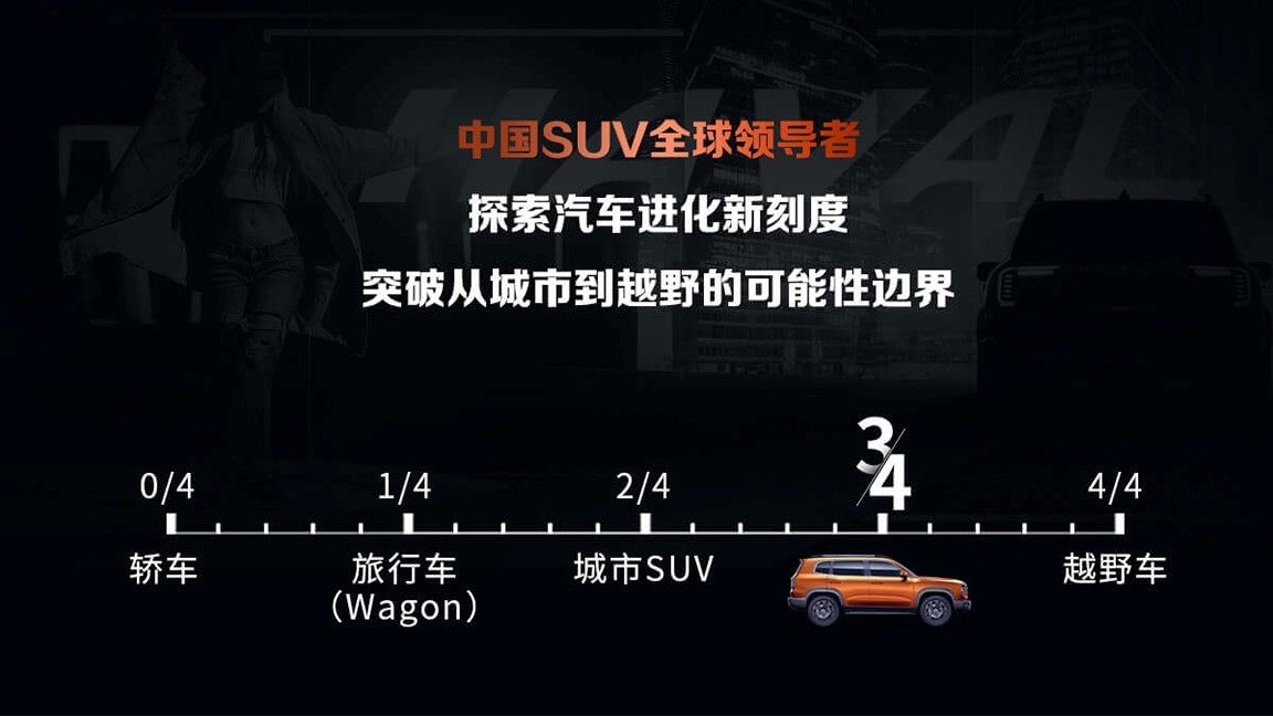 但最新的哈弗B06并不属于以上三系列之一,新车将归类到品牌全新序列中。与此同时,哈弗还给了新车一个精准的产品定位,在这条横轴上它被称为“四分之三”,并处于城市SUV和越野车之间,这意味着哈弗B06将是一款结合了城市SUV和纯粹越野车特点的新车。
