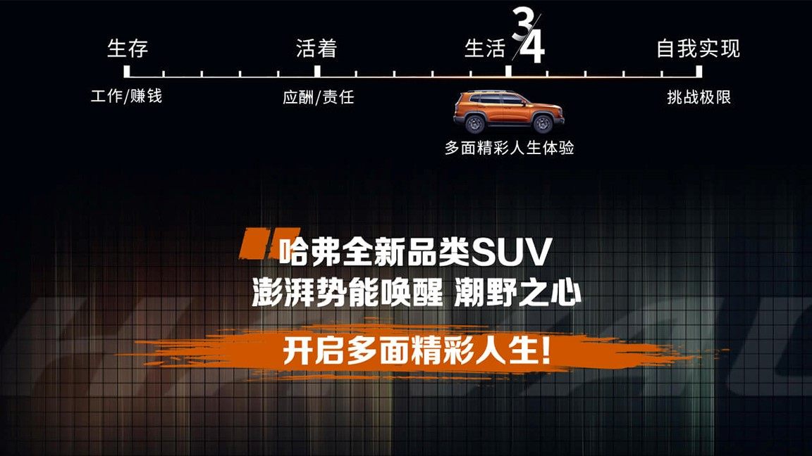 这条横轴可理解为汽车的品类发展历程,其列举的四类型车也当前的主流类型,但值得注意,虽然哈弗B06仍是一款SUV产品,但它作为第五类出现在横轴上,这也意味着传统的汽车类型逐渐饱和,市场或消费者都需要更新的理念来突破。