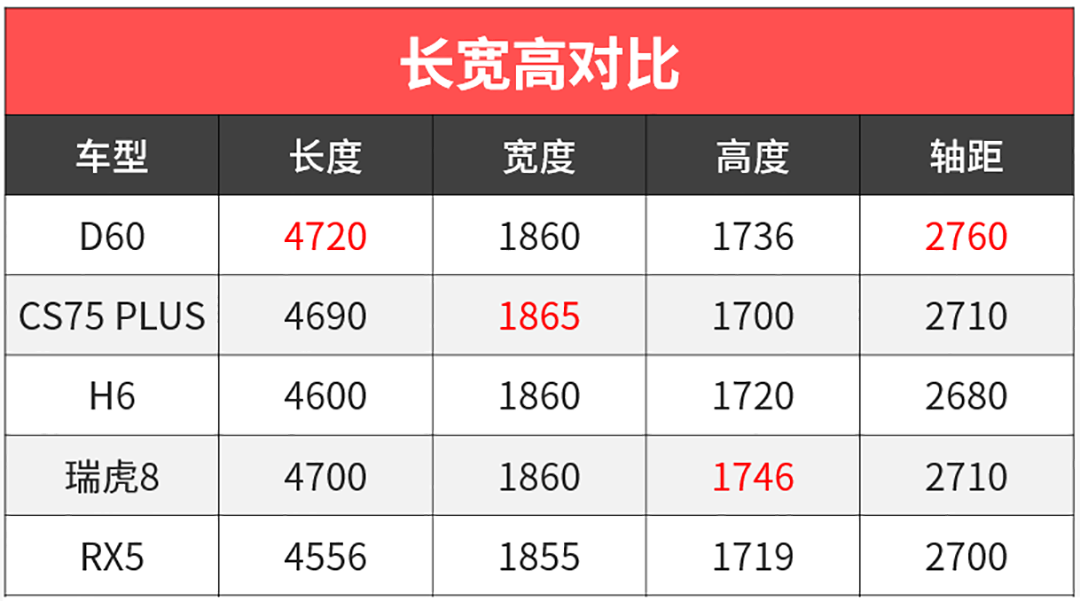 得益于4720mm的车长和2760mm的轴距,D60比起同级竞品CS75 PLUS等车型个头优势明显,甚至比同为中型车自称的瑞虎8都要大。