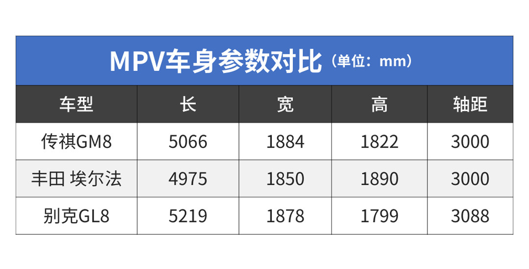 虽然GM8大师版还未公布车辆的车身尺寸以及轴距参数,但考虑到大师版应该不会在轴距方面做出过大的调整,所以在参数对比上我们选择现有的GM8车型与两者进行对比。参数对比中,别克GL8在车身长度和轴距上会相对占有一定优势,但三者之间差距并不大;而GM8和埃尔法轴距同样达到3米的长度,均满足大7座MPV的尺寸标准。