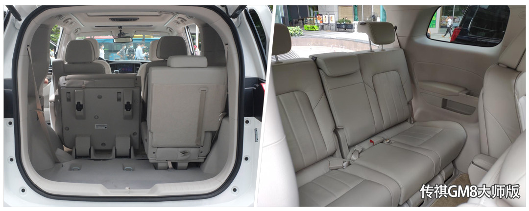 而GM8大师版在第三排使用情况下后备箱空间与埃尔法相近,但由于第三排座椅为向前翻折收纳,因此并不具有滑动调节机构。不过支持4:6比例放倒能够针对不同载人需求调节座椅布局。