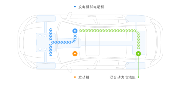 而混合动力模式是通过发动机驱动发动机供电,然后电动机对车辆进行驱动。虽然发动机是在工作状态,但离合器并未接合,发动机不直接对车轮输出动力。