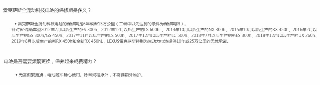 因此,在雷克萨斯官网上对于动力电池的疑问中也明确表示,“无需频繁更换,电池随车畅心使用。除常规程序外,不需要额外维护。”