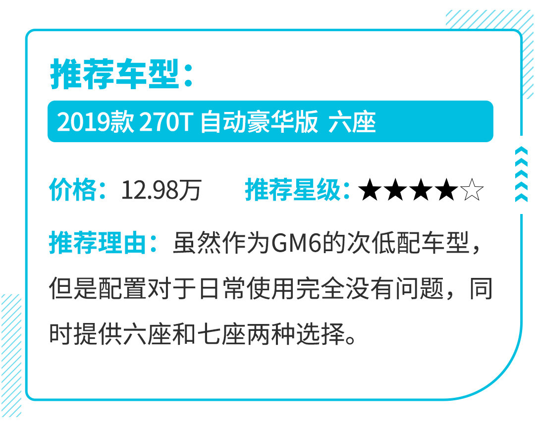不过动力配置虽然略微单一,但在座椅布局上GM6是提供了6座和7座两种,但鉴于年检制度来看,相同价格下6座更为划算,起码能省下2次年检。