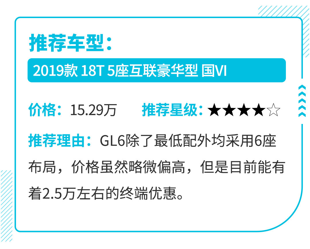 目前GL6在市场上有着2.5万的价格优惠,这样的幅度对于一款合资车型来说并不低,意味着只要10万出头就可以拥有一款合资MPV,这一点还是非常吸引的。