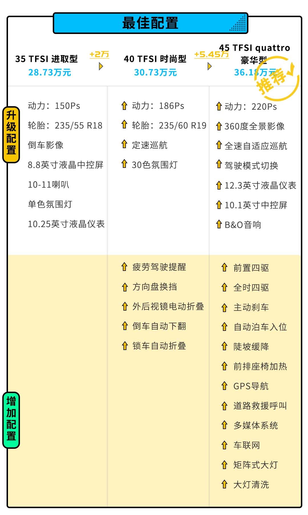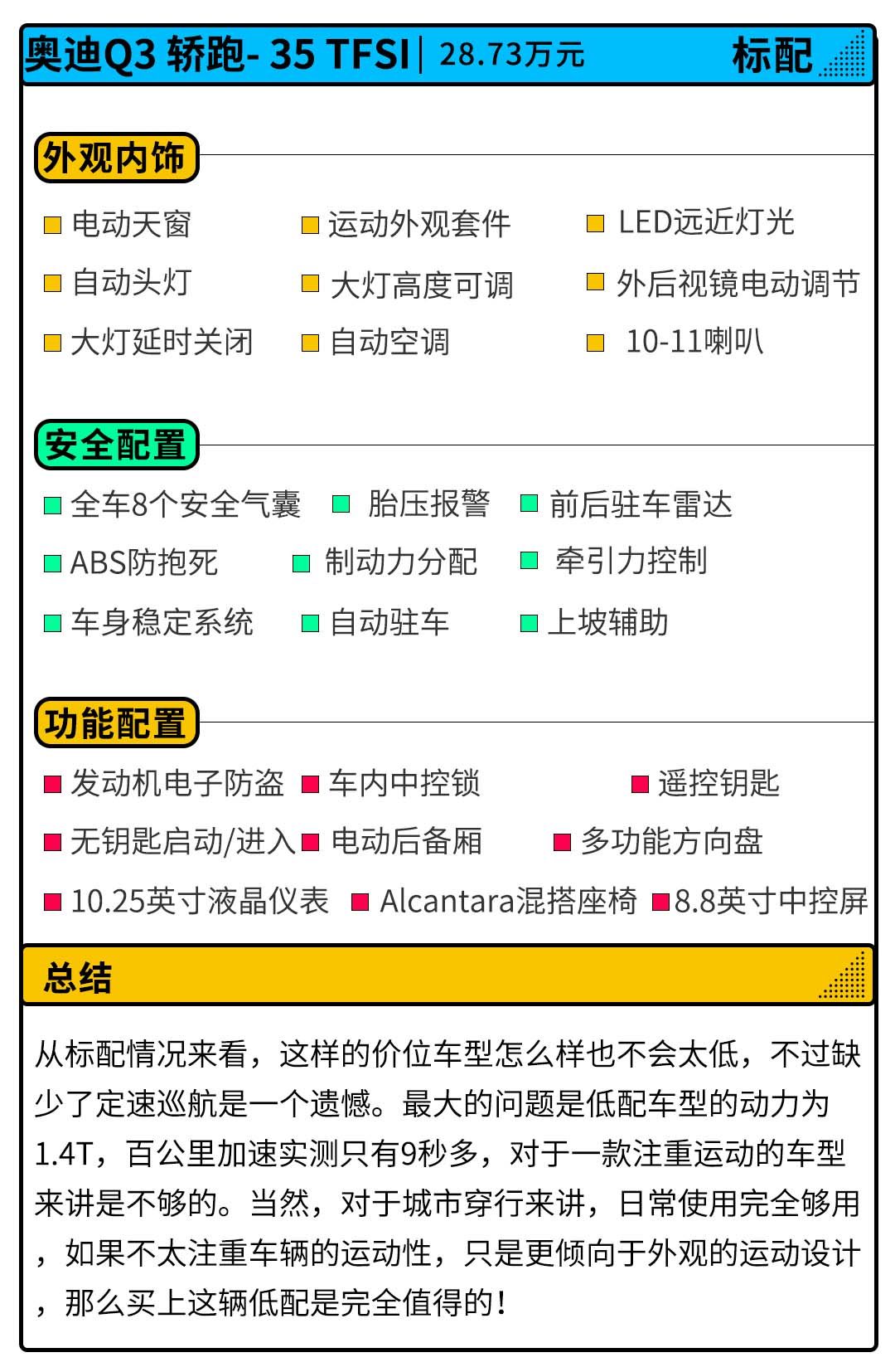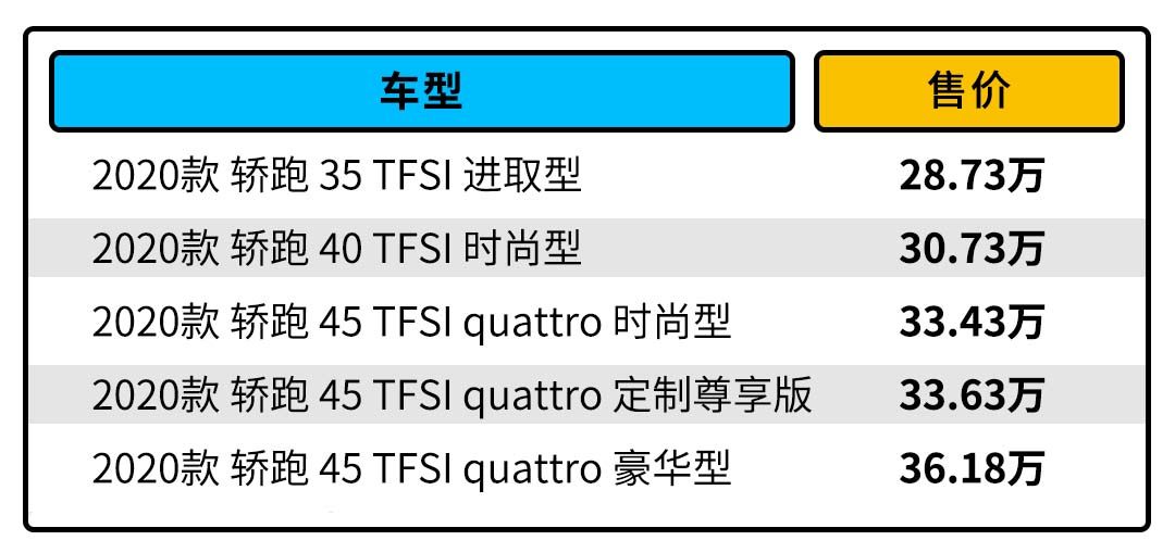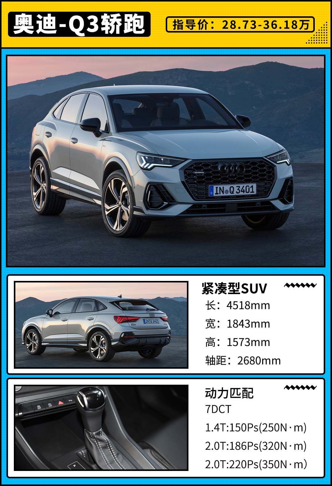 或许是潮流所向,或许是刻意为之,近期奥迪终于迎来了第二款溜背设计SUV——奥迪Q3轿跑(第一款是奥迪Q8)。 5月29日晚,奥迪Q3轿跑正式上市,新车共推出5种不同配置的车型,指导价格区间为28.73-36.18万元。这一期,买买君针对奥迪Q3轿跑的5款车型,来和大家聊聊,咱们应该怎么选!
