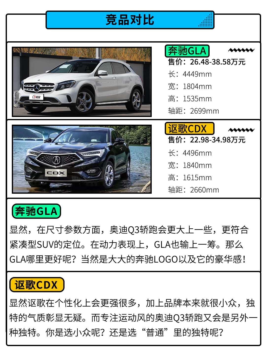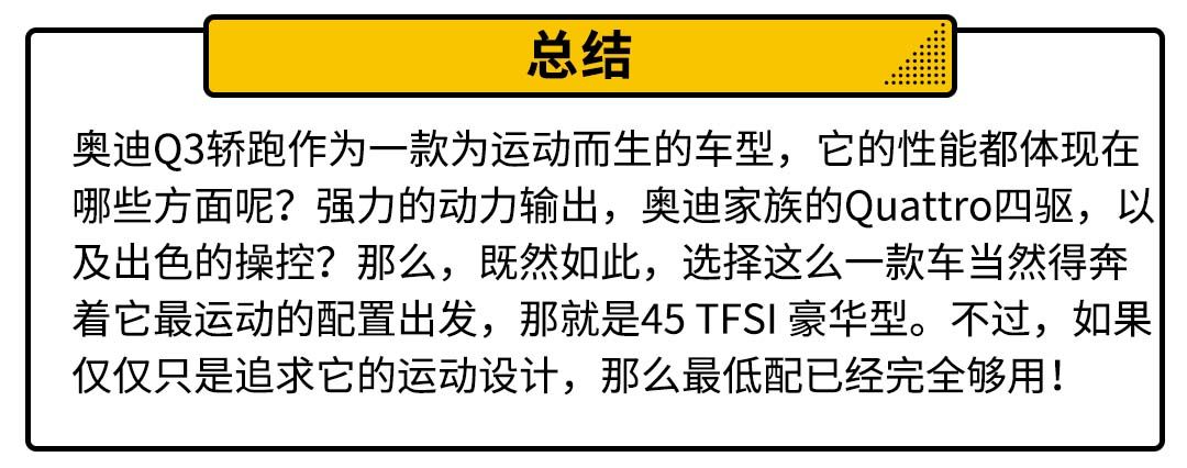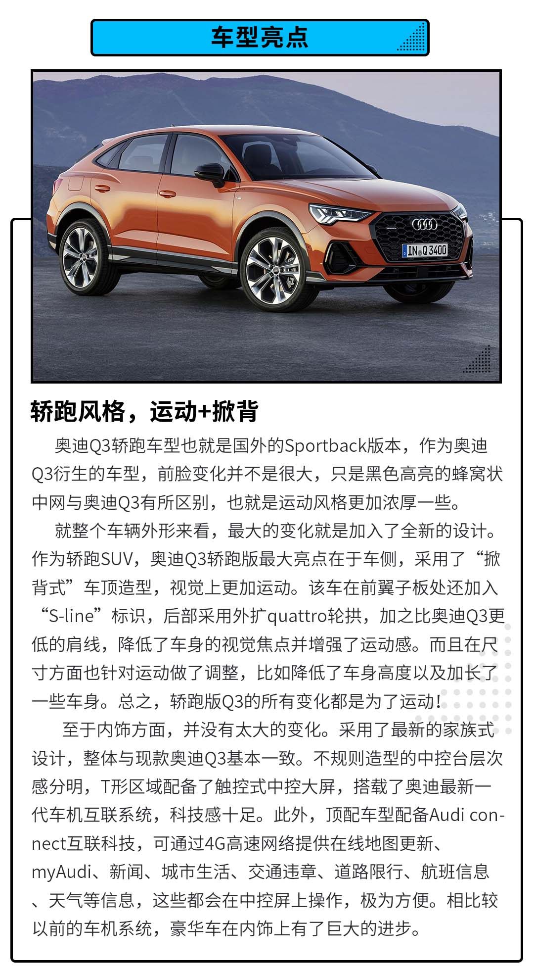 奥迪Q3轿跑的上市,作为奥迪第二款溜背设计SUV,是奥迪的一次跨越,一次创新。那么,关于这款不太一样的奥迪车型,它又有什么亮点呢?