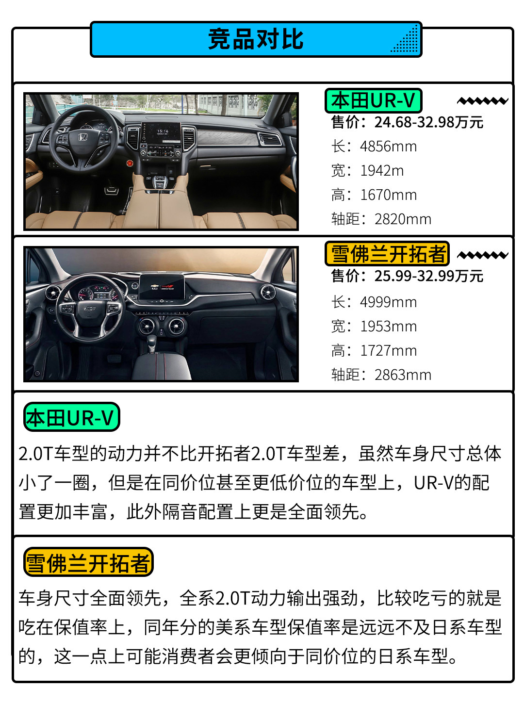 就算拿近日比较热门的雪佛兰开拓者,与新款UR-V作比较,也不难发现UR-V的优势不小。虽然在车身尺寸上小了一圈,但在保值率方面,日系品牌车型的保值率路人皆知;再加上新款UR-V“主动降噪系统”以及“全车双层玻璃”的加持,绝对让它更适合家庭用车的身份。