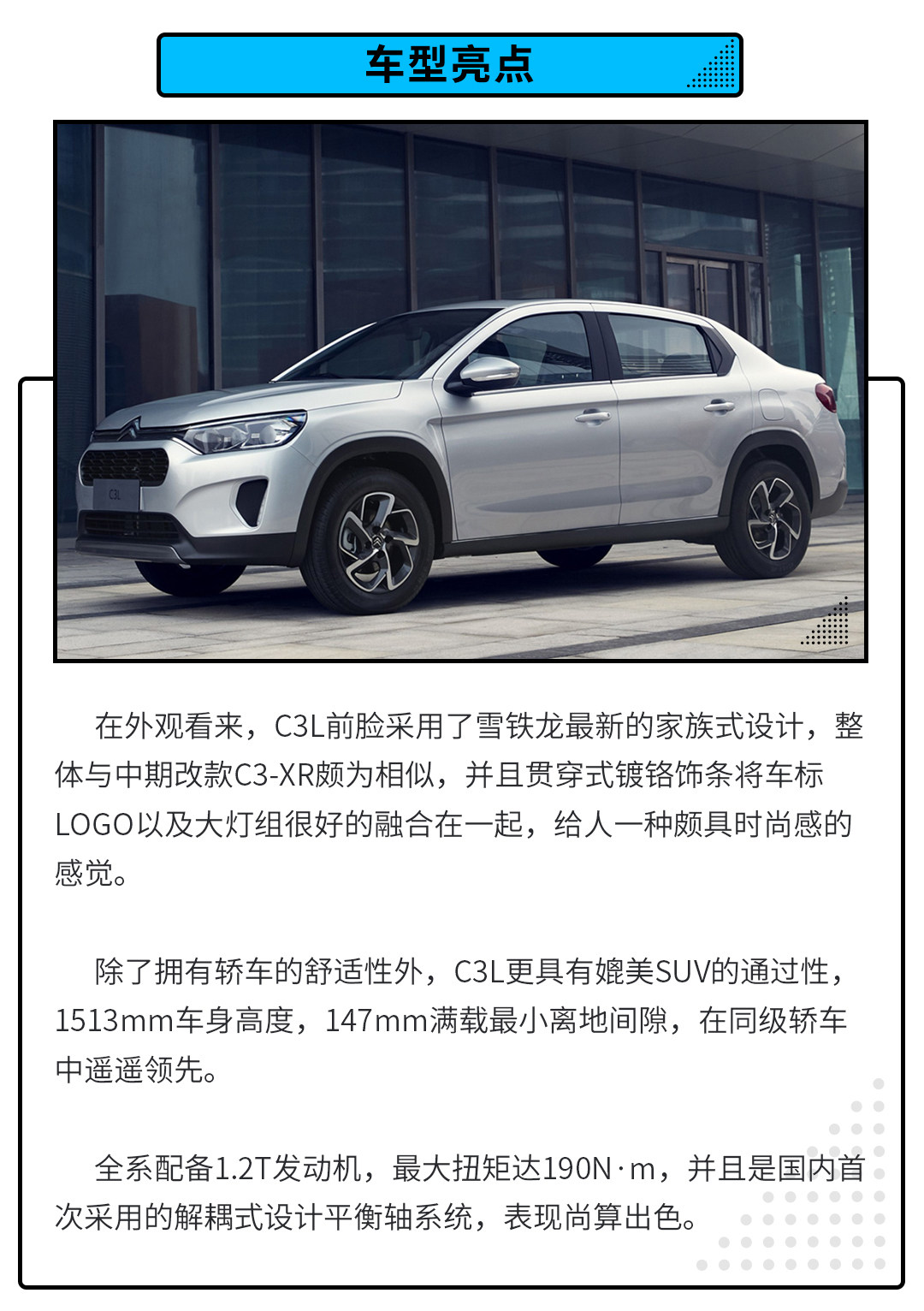 要数最为出色的车身数据那就是高度方面了,C3L拥有着SUV般的高度和离地间隙,相比其他对手而言能拥有着较好的通过性。动力方面,C3L全系搭载一台1.2T三缸发动机,高配车型上还配备了6速双离合变速器,感觉是没从以往吸取教训啊。
