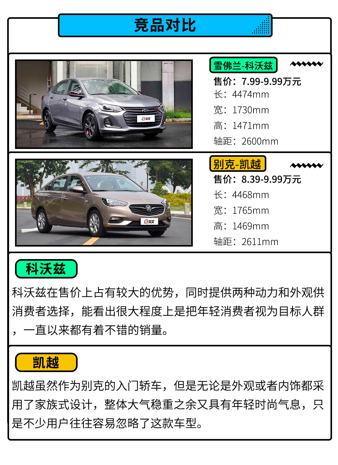 相比起其它对手来说,都是各自有着不同的优势,科沃兹和凯越是市面上两款非常典型全系采用三缸发动机的车型,两辆车在销量上也有着一定的差异,面向年轻消费群体的科沃兹相对会更受欢迎。