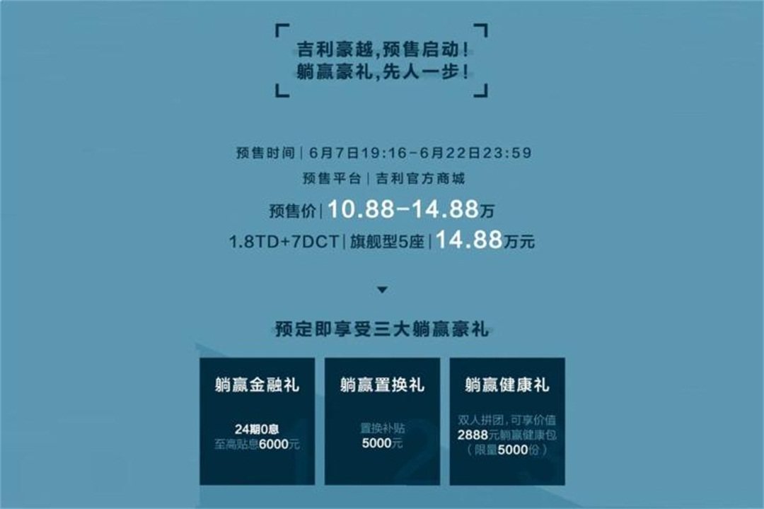 6月7日,吉利官方宣布全新车型豪越正式开启预售,预售时间为6月7日19点16分—6月22日23点59分,其预售价格为10.88—14.88万元。吉利豪越作为一款全新车型,是一款定位为中型的SUV,在动力方面,搭载了1.5T和1.8T两款发动机,此外,现在预订豪越的消费者还能享受到置换补贴,以及优惠金融政策等。
