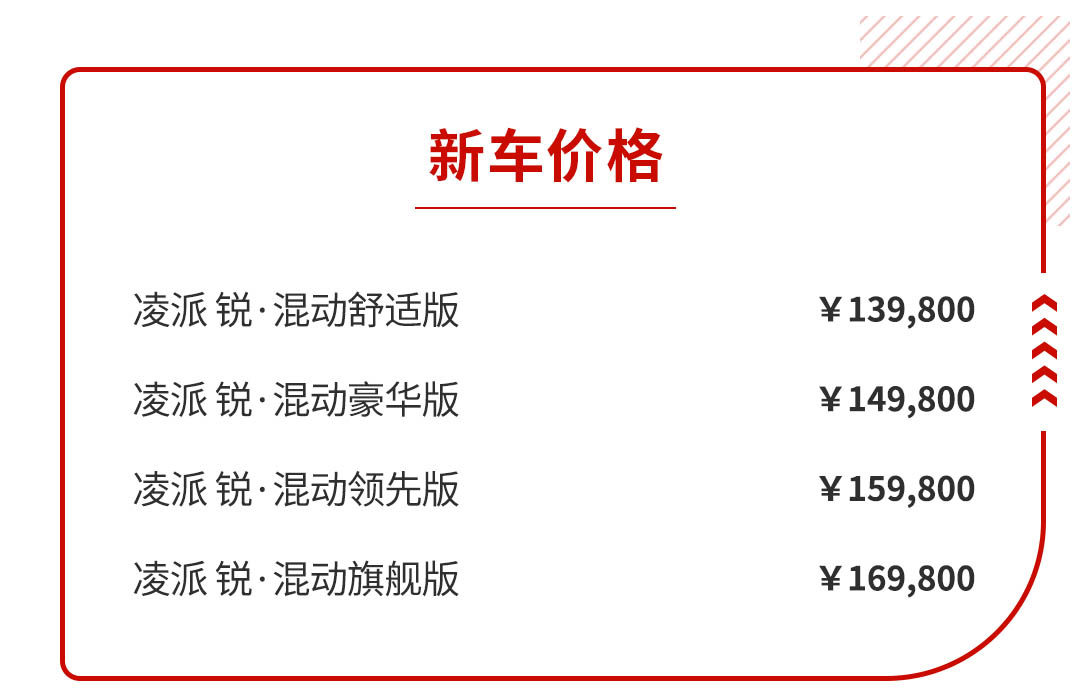 6月10日,凌派混动版正式上市。新车售价13.98-16.98万元,共提供了4款配置车型。在动力上,新车搭载本田1.5L第三代 i-MMD双电机混合动力系统,这也是本田将该套动力系统首次引入到国内市场来。值得一提的是,该款凌派锐·混动最低综合油耗仅为4.1L,发动机+电动机配合最大功率可达154马力。