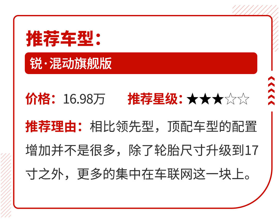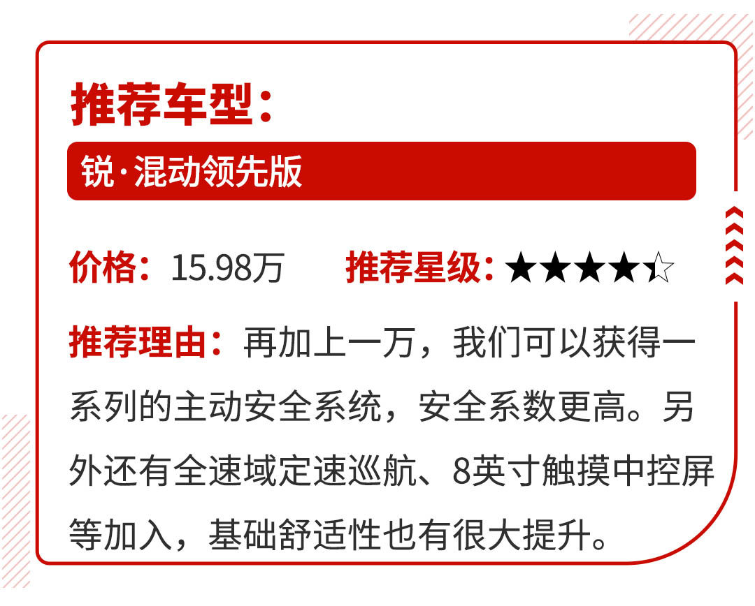 而如果是追求科技与舒适配置的话,教授会推荐领先版本。同样是再加上一万,我们可以获得包含车道偏离预警系统、车道保持辅助系统、道路识别交通标志、主动刹车/主动安全系统等在内的主动安全系统;而在基础舒适配置上,又有倒车影像、车侧盲区影像、全速域定速巡航、8英寸中控屏、多功能方向盘等等,整体使用感受会大大的提升。