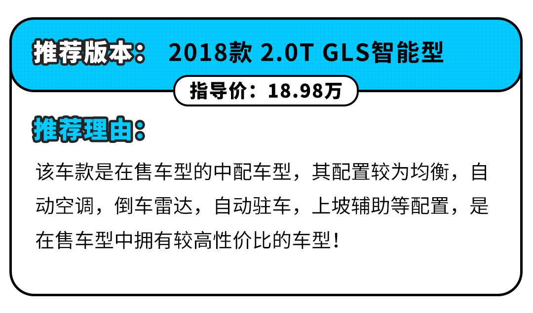 该车款是在售车型的中配车型,其配置较为均衡,自动空调,倒车雷达,自动驻车,上坡辅助等配置,对于售价18.98万元的2018款 2.0T GLS智能型,还算能过得去。