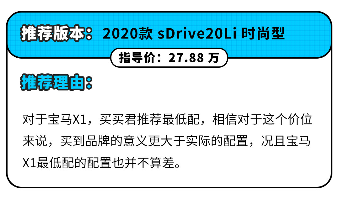 宝马X1买买君推荐的车型为最低配sDrive20Li 时尚型,主要是因为购买入门级豪华车,车标更重要,配置倒是其次,况且在买买君看来,宝马X1的时尚型配置其实也并不差。一句话,你买不了吃亏,买不了上当。