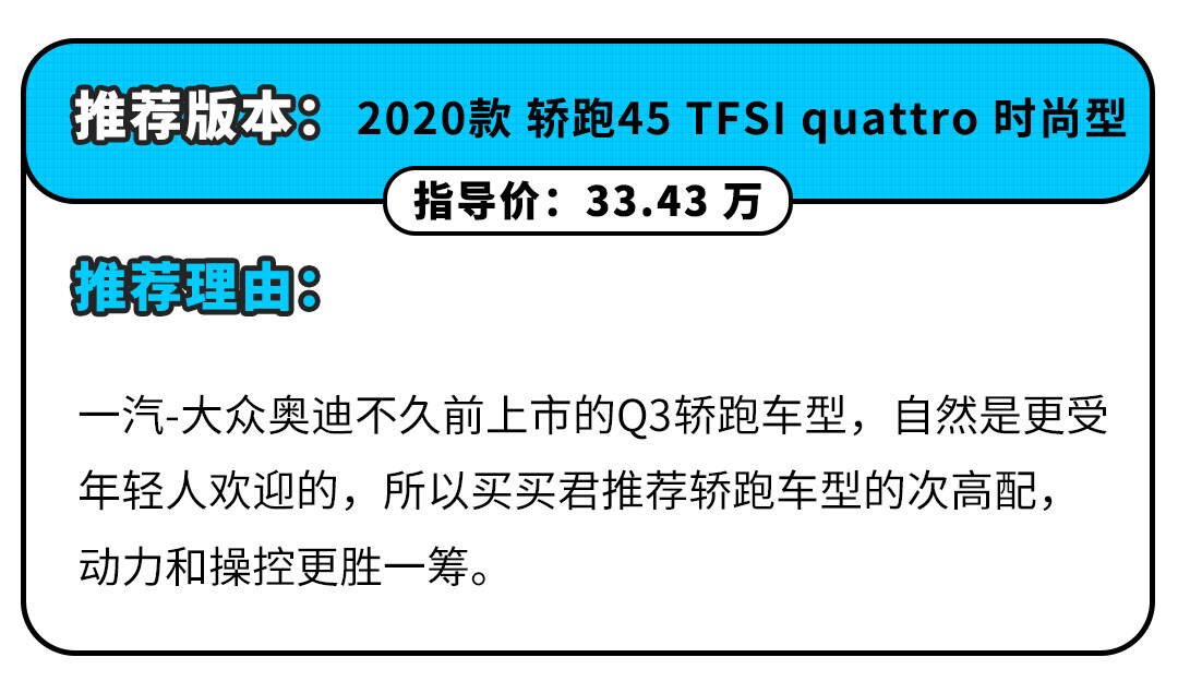 由于奥迪Q3的轿跑版也在最近上市,买买君当然更推荐大家入手轿跑版车型,因为轿跑版的外形更加运动。具体车型,买买君推荐次高配,毕竟除了拉风外型以外,还得需要更为强劲的quattro四驱。