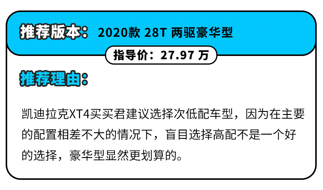 买买君推荐车型为次低配两驱豪华版,因为其实凯迪拉克XT4的高抵配车型之间的差别并不大,因此在现在并没太多优惠的情况下,两驱豪华版是个更好的选择。