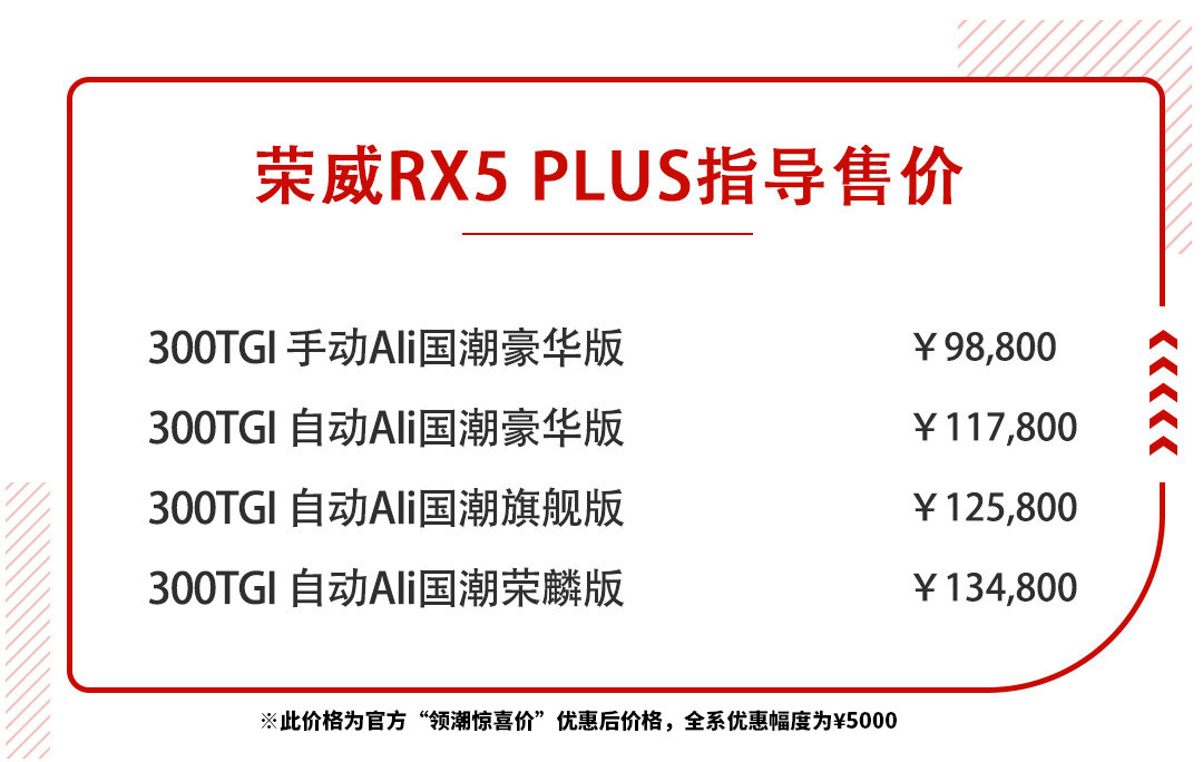 值得一提,此次上汽荣威还随RX5 PLUS向购车消费者附赠终身原厂质保、终身免费保养和终身免费基础流量。此次推出的荣威RX5 PLUS共提供四款车型,其中包含一款手动挡车型,而教授这次首推的是300TGI 自动 Ali国潮荣麟版车型,也是自动挡的最入门版。荣威一如既往地发挥了自己的配置优势,荣威RX5 PLUS的标准配备已经相当丰厚,相比自动挡中配版仅少了全景天窗和360环影,但中配版也不配备自适应巡航系统,因此入门版无疑是最值得推荐的性价比之选。